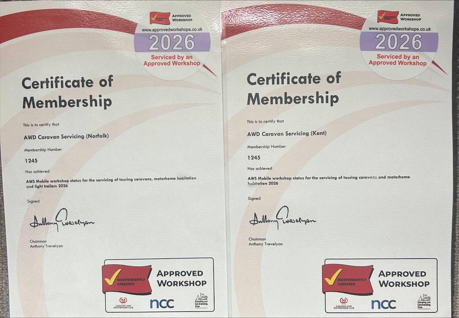 The company has received the Approved Mobile Workshop Certificate for the last 20 years which is approved by The Camping and Caravanning Club, The Caravan Club and the National Caravan Council.